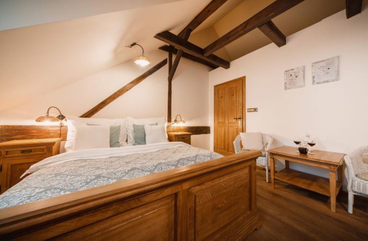 • Nabízíme dvoulůžkový pokoj v podkroví s manželskou postelí a rohovou vanou