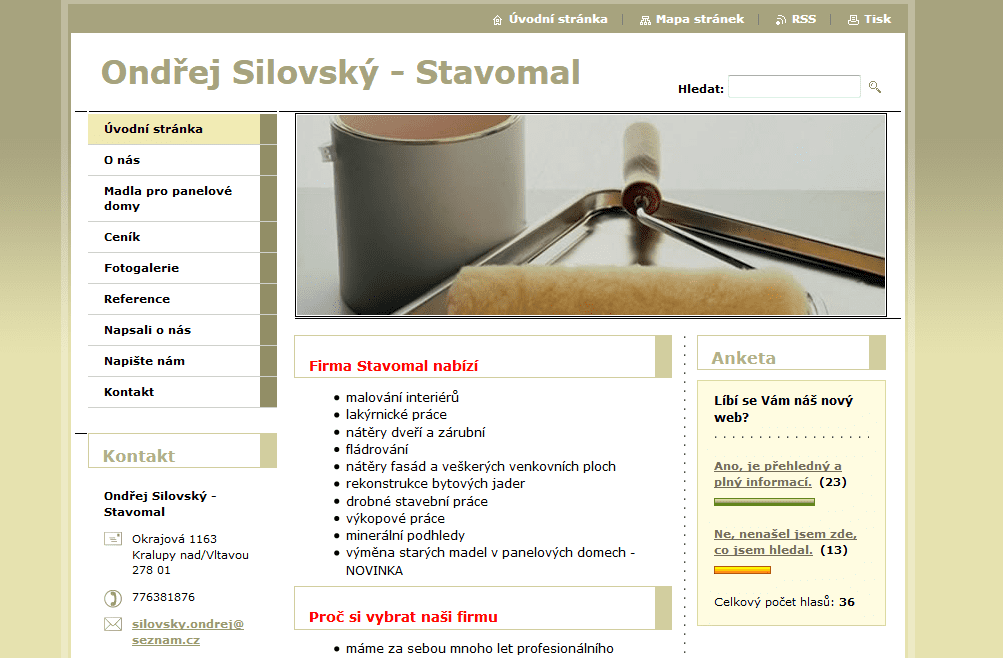 Jsme menší firma, která působí na trhu práce od roku 1991. Základní filozofií společnosti je uspokojování potřeb a požadavků našich zákazníků v oboru malířství a natěračství a to v nejvyšší možné kvalitě. Zdarma přijedeme, prokonzultujeme návrh zakázky z hlediska pracovních postupů, použitých materiálů a malířských technik. Pro vaši inspiraci nabízíme výběr ze vzorníků barev. Vytvoříme vám nezávaznou cenovou nabídku.
