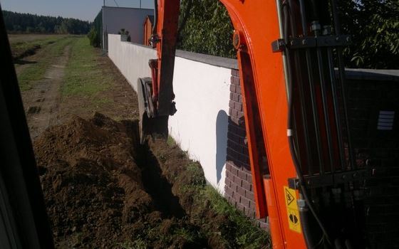 Zemní práce jsou prováděny pásovým minibagrem Kubota KX91-3 o hmotnosti 3,2 tuny a hloubkovým dosahem 3,3 metru.