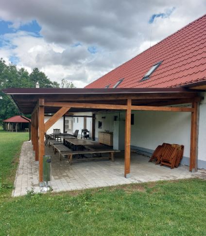 Ve srubu se nachází společenská místnost s malou kuchyňkou, ledničkou a krbovými kamny.